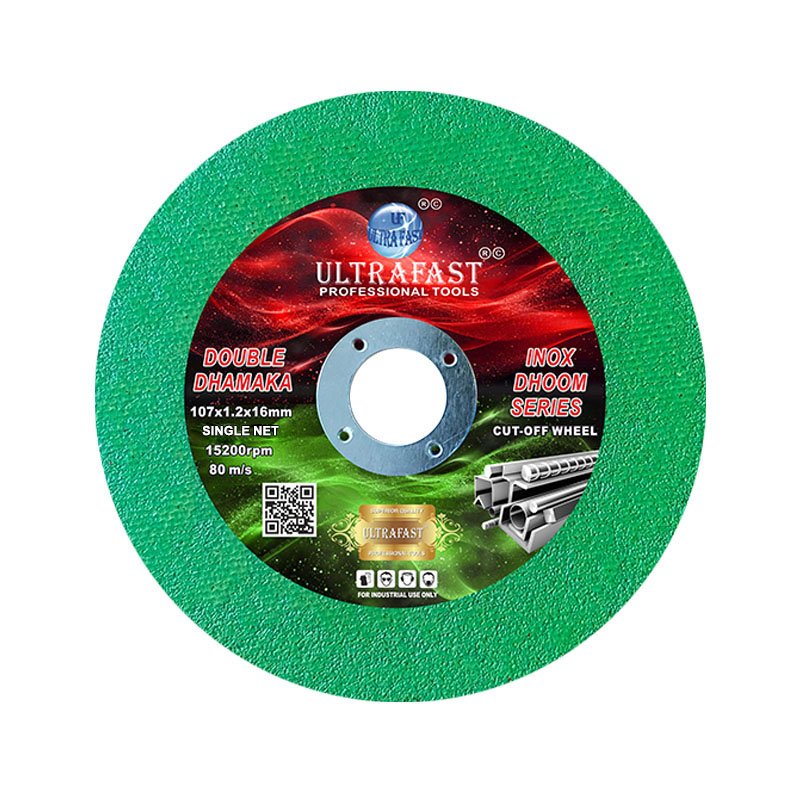 Boost your cutting precision with the Ultrafast Cut-off Wheels Single Net Dhoom Series – Double Dhamaka, featuring a unique dual-color design—green on one side and red on the other—for enhanced visibility and directional use. Engineered for cutting stainless steel, mild steel, and cast iron, this disc provides clean, fast cuts with reduced burrs and minimal material loss. Built with high-grade abrasive grains and single-net reinforcement, the UF Dhoom Double Dhamaka Wheel ensures balanced performance for general metal cutting. Widely used across India in fabrication and light construction, it’s a practical, easy-to-handle solution for everyday workshop tasks.