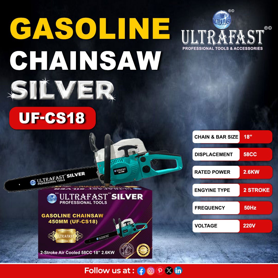 The Ultrafast UF-CS18 Gasoline Chain Saw is a powerful and reliable cutting tool designed for farm, forestry, and heavy-duty outdoor applications. Powered by a robust 2600-watt engine with 58CC displacement, it delivers a consistent 3000 RPM for efficient cutting of medium to thick tree trunks, hardwood logs, and firewood. Featuring a 450MM guide bar, it provides the perfect balance of maneuverability and reach. The 550ML fuel tank and 260ML oil tank support extended operation, while the 2-stroke air-cooled engine ensures better heat dissipation and lower maintenance. Ideal for agricultural and landscaping professionals, the UF-CS18 from the Silver Series guarantees rugged performance, fuel efficiency, and long service life in outdoor conditions.