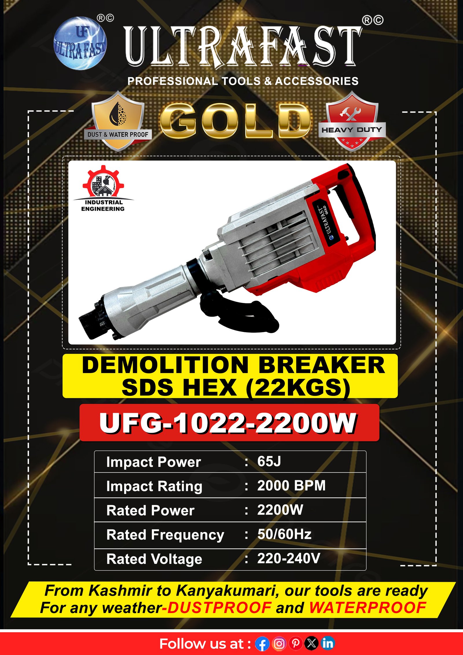 The Ultrafast Gold Series UFG-1022 Demolition Breaker is a heavy-impact powerhouse, engineered for industrial-level demolition tasks. Backed by a massive 2200-watt motor and delivering a striking 65-joule impact force at 2000 BPM, it can take on reinforced concrete, asphalt, and rock with ease. The robust MAX tool holder ensures solid chisel stability under extreme load, while the rugged construction handles the harshest site conditions. Designed for builders, infrastructure crews, and demolition specialists, this breaker guarantees long service life, consistent impact power, and minimal downtime—making it a top-tier tool for serious demolition projects.